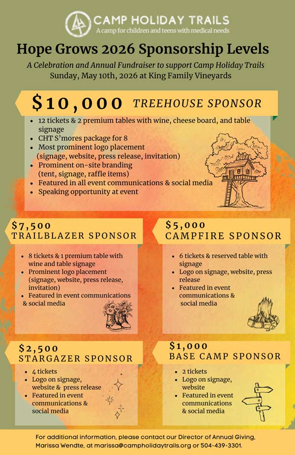 Camp Holiday Trails is proud to partner with community leaders and organizations that support our mission of creating a community for children and teens to thrive. We humbly thank all of our sponsors for their support.